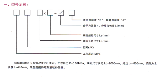 矩形波紋補(bǔ)償器型號寫法,舉例:0.02PJX2000*800-2/410F,表示:工作壓力P=0.02MPa,端面尺寸長邊Lp=2000,短邊Ls=800mm,波數(shù)為2,長度=410mm,法蘭連接的矩形波紋補(bǔ)償器。如果是接管連接的 后一個(gè)字母用J來表示。其中“PJX”為矩形波紋補(bǔ)償器產(chǎn)品字母型號代表,是通用符號,也有廠家不用這個(gè)符號。